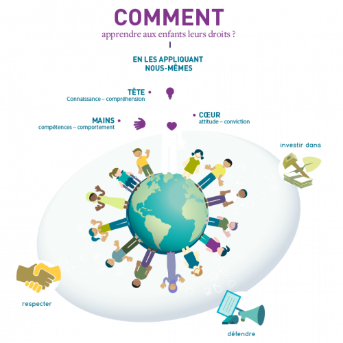 L'éducation aux droits de l'enfant offre aux enfants la possibilité de développer les valeurs, les comportements et les compétences nécessaires pour défendre leurs droits et les mettre en pratique. Aidez-les à travailler ensemble, à assumer leurs responsabilités, à se défendre, à accueillir la diversité, à respecter les différences, à s’engager, à faire preuve de solidarité ...