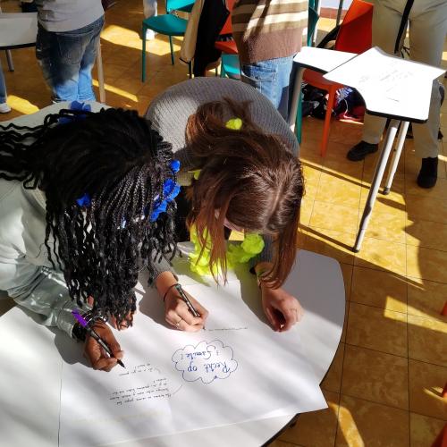 Genoeg geluisterd! Via een schrijfgesprek ontdekken we de eerste ideeën van de leerlingen. Alles wordt zorgvuldig genoteerd en daarna gaan we aan het stemmen: wat vinden zij belangrijk en waar willen zij precies aan werken op school? Dat wordt het onderwerp van onze volgende bijeenkomsten. Wordt vervolgd…!