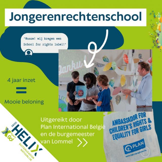 SBSO Helix in Lommel kreeg op 26 juni 2023 de titel School for Rights (S4R). Na drie jaar intensief werk rond jongerenrechten ontving de school het label van Plan International België. Dit maakt hen niet alleen de eerste school in Limburg met dit label, maar ook de allereerste school voor buitengewoon onderwijs in heel Vlaanderen!